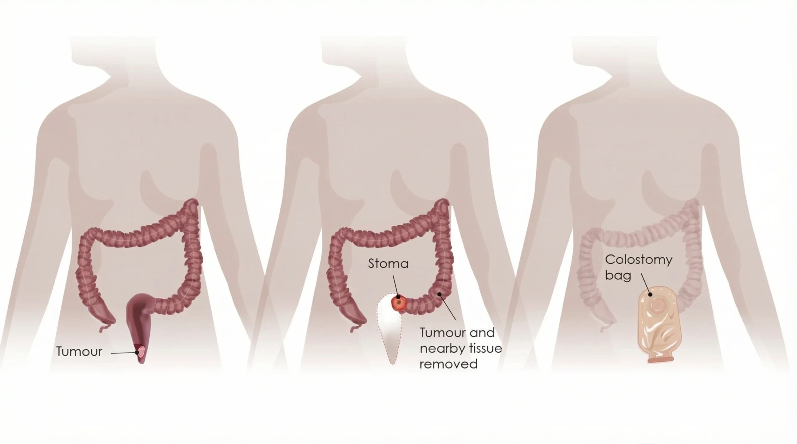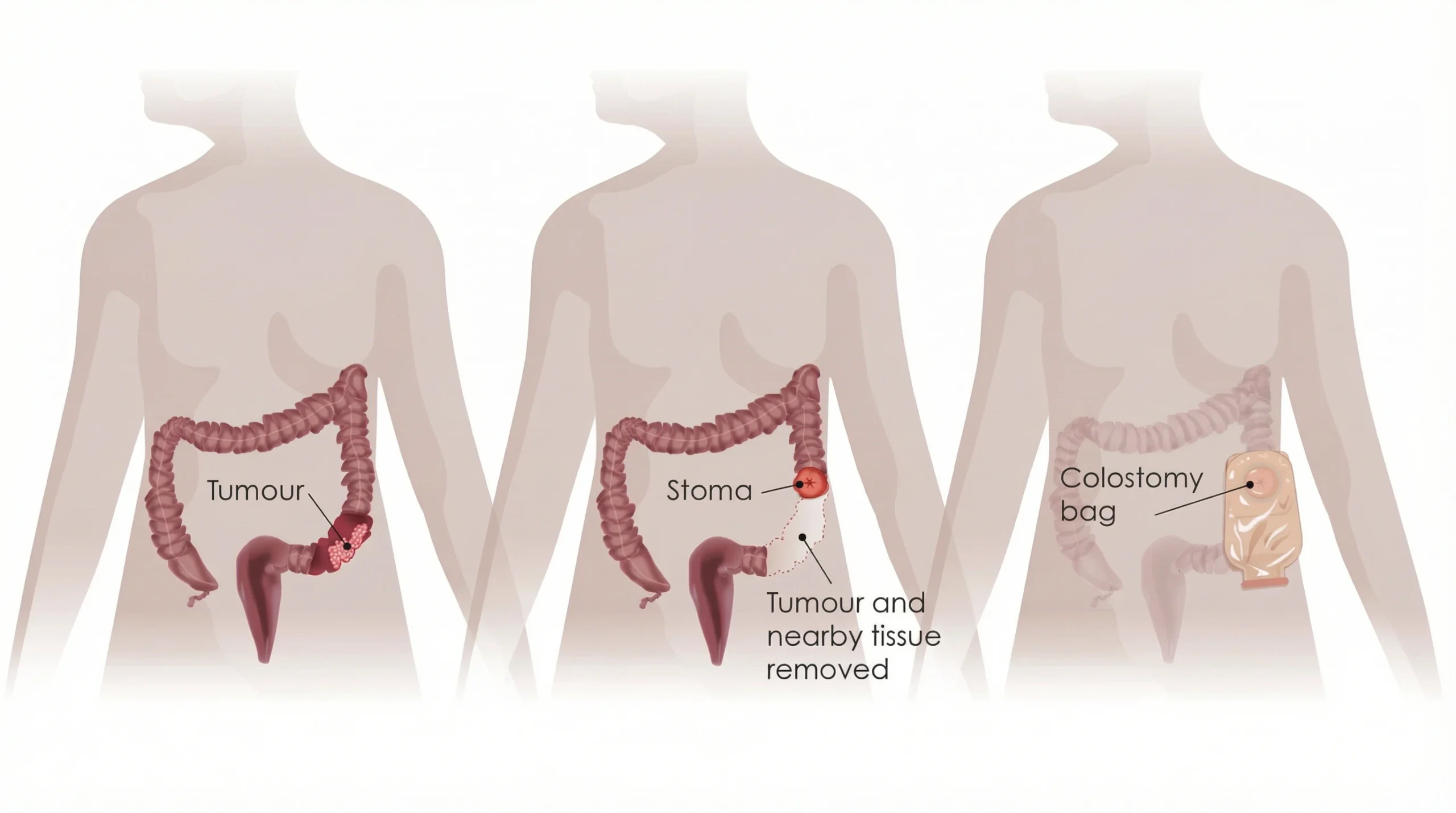 - In some situations, a temporary or permanent stoma may be needed (depends on tumor location, safety, and patient condition)