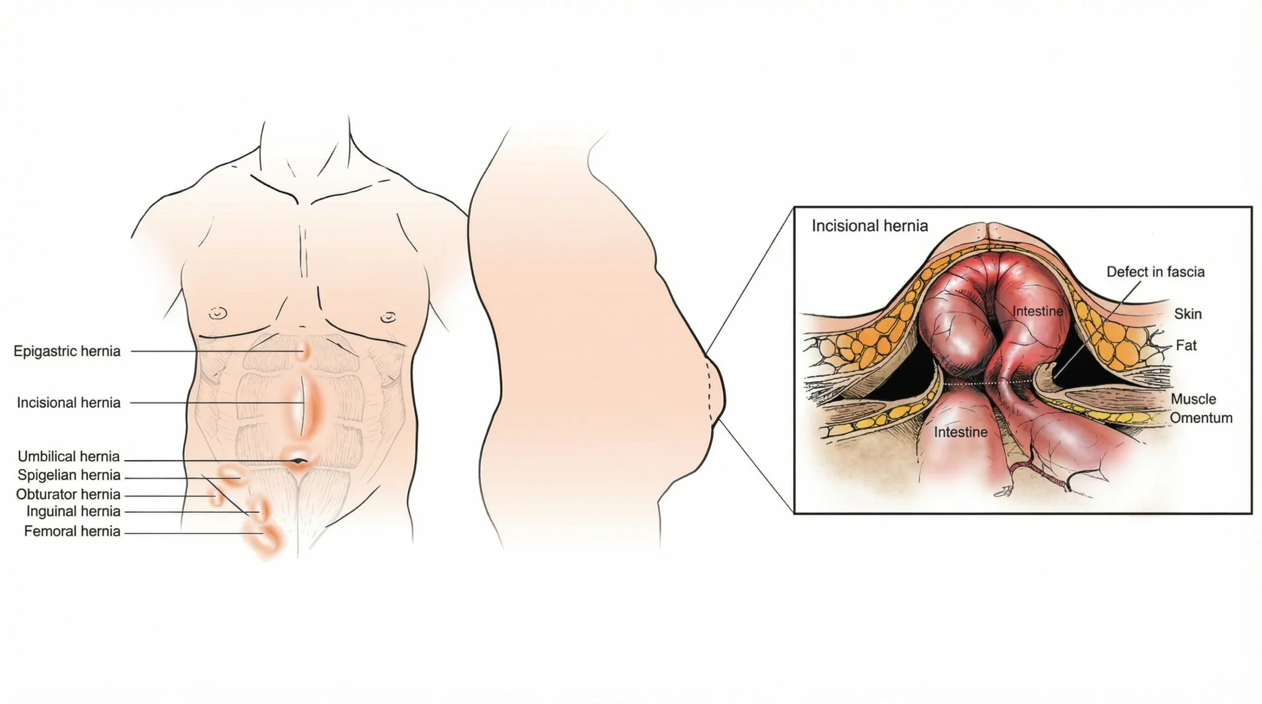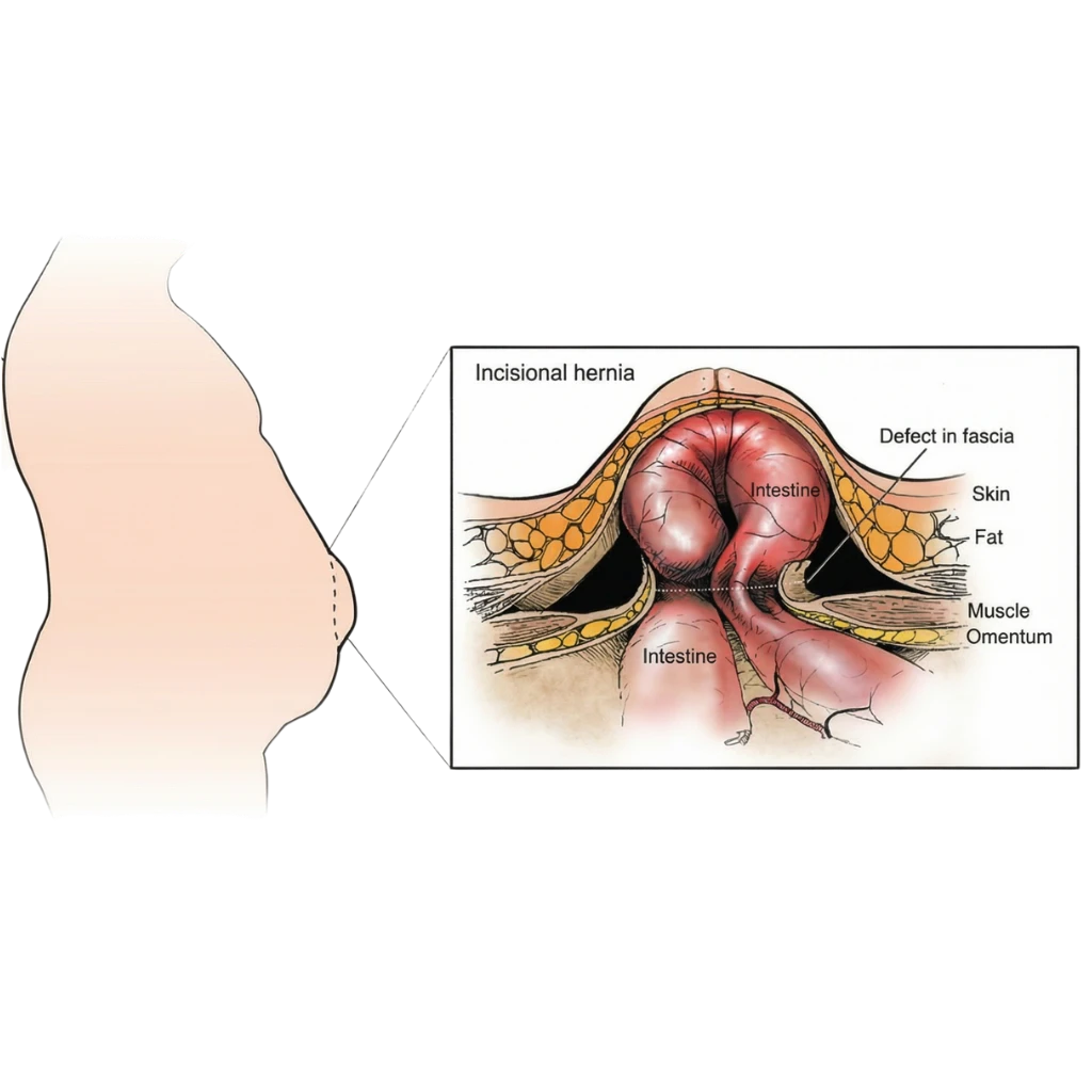 An Incisional Hernia happens when a weakness develops at the site of a previous surgical scar on the abdomen, allowing tissue (fat or intestine) to push through and form a bulge. Incisional hernia repair strengthens the abdominal wall—often using mesh—and can be done laparoscopically in many cases for smaller scars and faster recovery.